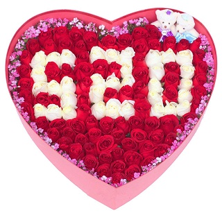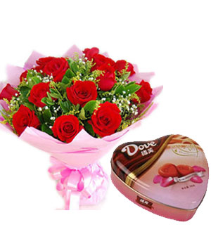 • 【19枝紅玫瑰,綠葉、滿天星 】 + 【德芙鐵盒心形巧克力(98克)】